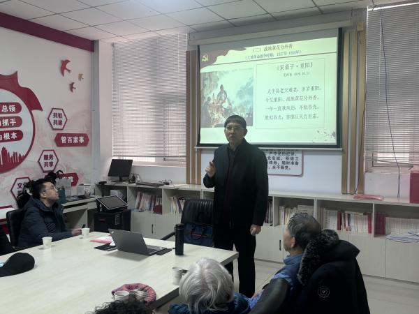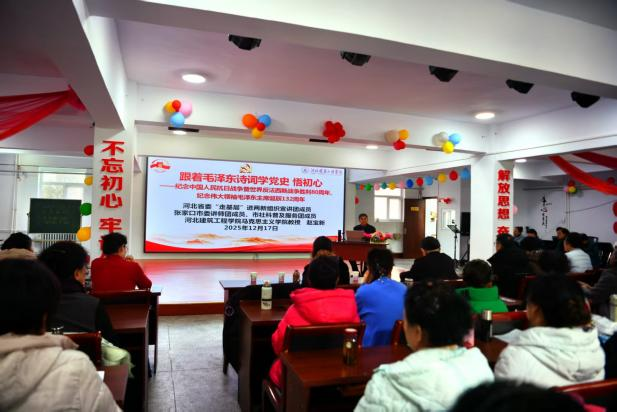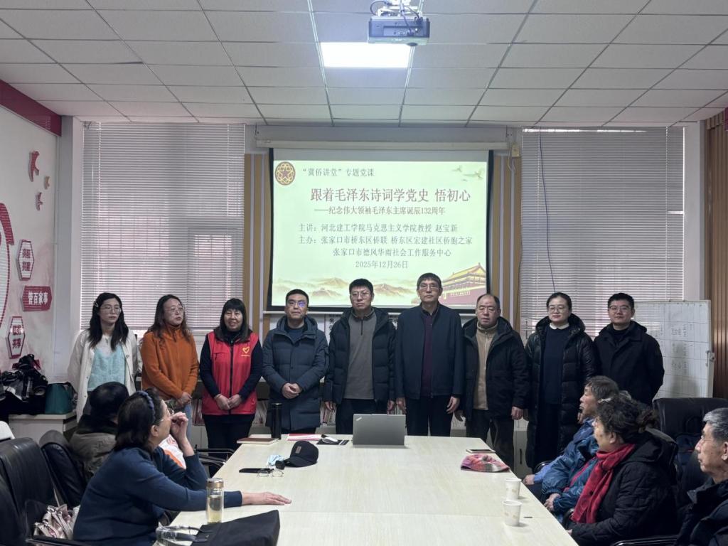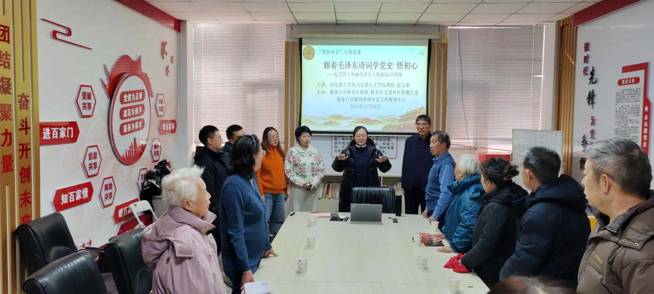 今年是中国人民抗日战争暨世界反法西斯战争胜利80周年,也是伟大领袖毛泽东主席诞辰132周年,为弘扬伟大抗战精神,缅怀领袖丰功伟绩,12月26日上午,在伟大领袖毛泽东同志诞辰132周年之际,我院赵宝新和温佳钰两位老师走进桥东区红旗楼街道宏建社区,为社区老人、社区干部和参与志愿服务的大学生志愿者,开展了以“跟着毛泽东主席诗词学党史悟初心”为主题的“冀侨讲堂”专题党课公益宣讲。此次党课由张家口市桥东区侨联、桥东区宏建社区侨胞之家和张家口市德风华雨社会工作服务中心共同主办,张家口市侨联主席王磊,河北建筑工程学院党委宣传(统战)部副部长任路伟,桥东区委统战部一级主任科员周艳红,桥东区侨联副主席周俊,桥东区红旗楼街道宏建社区书记、宏建社区侨胞之家负责人赵伟丽等领导看望了志愿者并参加了专题党课。党课由市侨联原秘书长、河北省信用协会张家口办事处秘书长朱国英主持。