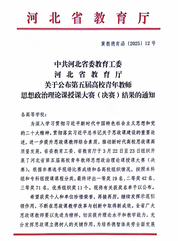 近日,由中共河北省委教育工委、河北省教育厅组织的河北省第五届高校青年教师思政课授课大赛(决赛)在河北工业大学落下帷幕,来自全省各高校的132名优秀青年思政课教师参加了比赛,经过激烈角逐,我校马克思主义学院选派的青年教师郑莹获得本科组《形势与政策》课二等奖,青年教师马春燕获得本科组《毛泽东思想和中国特色社会主义理论体系概论》课三等奖。